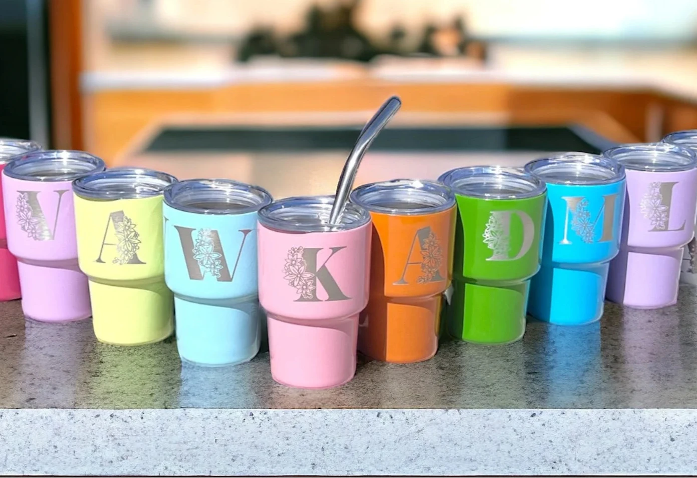 Personalized Permanent Engraved Floral letter and Name 2 oz Mini Tumbler with Straw